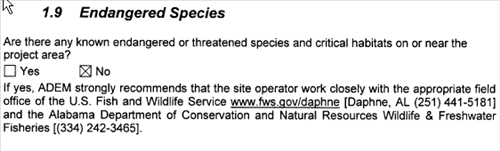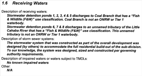 It should be noted that both Coal Branch and the unnamed tributary of the Little Cahaba flow into the Little Cahaba River. Thus, all runoff from Cotswold's activities has been discharged into the Little Cahaba River. Pictures of the damage to the river at the confluence of Coal Branch and the Little Cahaba are attached as exhibits to Objection2h.html. You can go directly to the pictures by clicking here: Exhibit C to Ltr to Jeffco Cnty Commission. Additional pictures can be found at May 13, 2007, Damage to the Little Cahaba River. It it hard to see how the CBMPP Filing can state that there are “[n]o known impaired waters,” when there is abundant evidence of damage to the Little Cahaba.